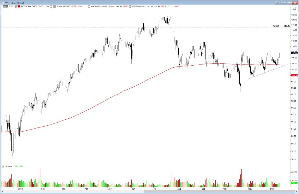 Finally, Paypal, PYPL, is consolidating in an ascending triangle on the daily scale (not weekly, it’s a bit small to see on that scale). It recently bounced off the 40 week EMA and is challenging the upper boundary of the triangle. If it can break out and join the market rally, it could reach a possible target of 117.10.