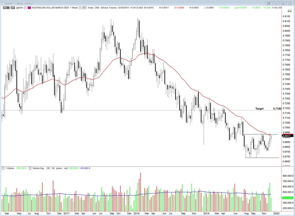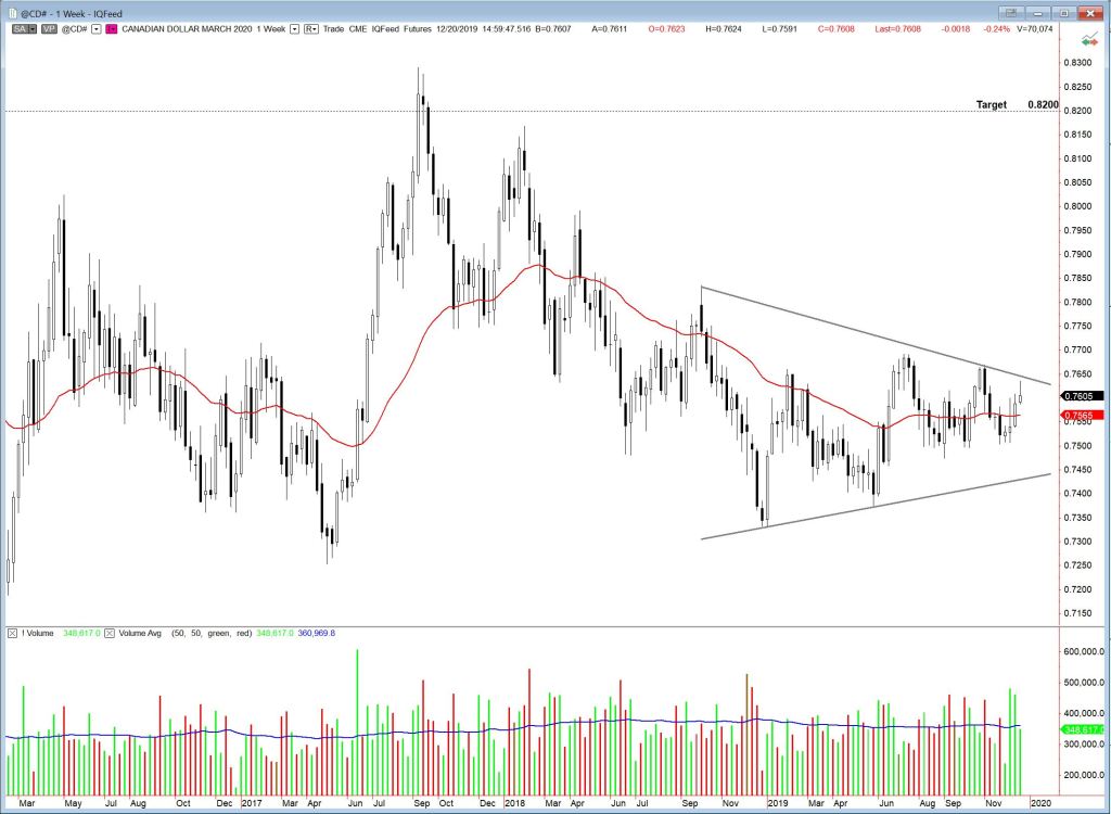 The Australian and Canadian dollar futures charts are forming rectangle and symmetrical triangle patterns, respectively, and could be poised for a breakout. Both are rooted in commodity-based economies, and could be sending a message regarding where we are at in the commodity cycle. $AD_F needs to clear the 40 week EMA before a position is initiated, and both need to clear pattern boundaries.