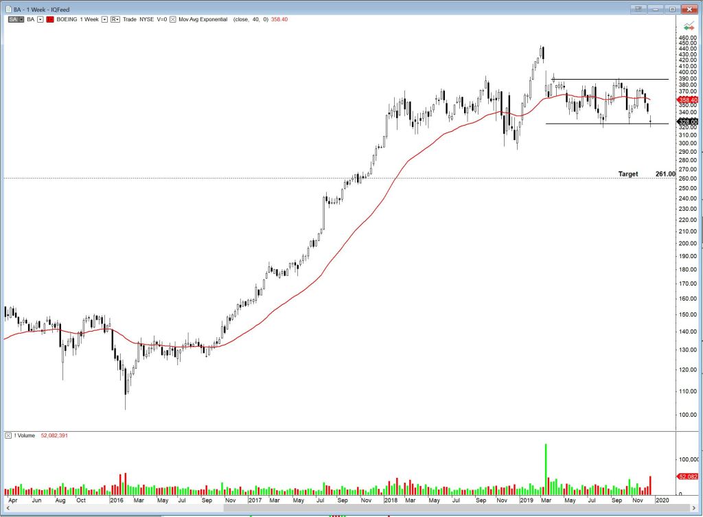 On a more somber note, there actually is a stock or two that are fighting the tape and going down. Boeing, BA, for one. It is trading in a well-defined range and a downside breakout could yield a target of 261. This week’s candle formed a doji at the base of the rectangle.
