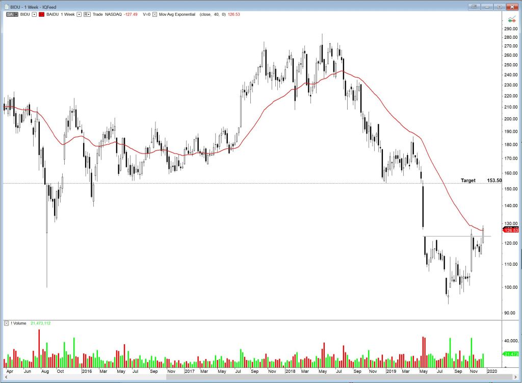 Baidu Inc ADR, BIDU, is a bit beaten up but could be ready for a turnaround. It has formed a possible reversal pattern, an inverted head and shoulders. The gap from May has been tested twice now and we want to see it continue up rather than retracing a third time. It is trading just above the horizontal neckline and above the 40 week EMA. Upside target 153.50.