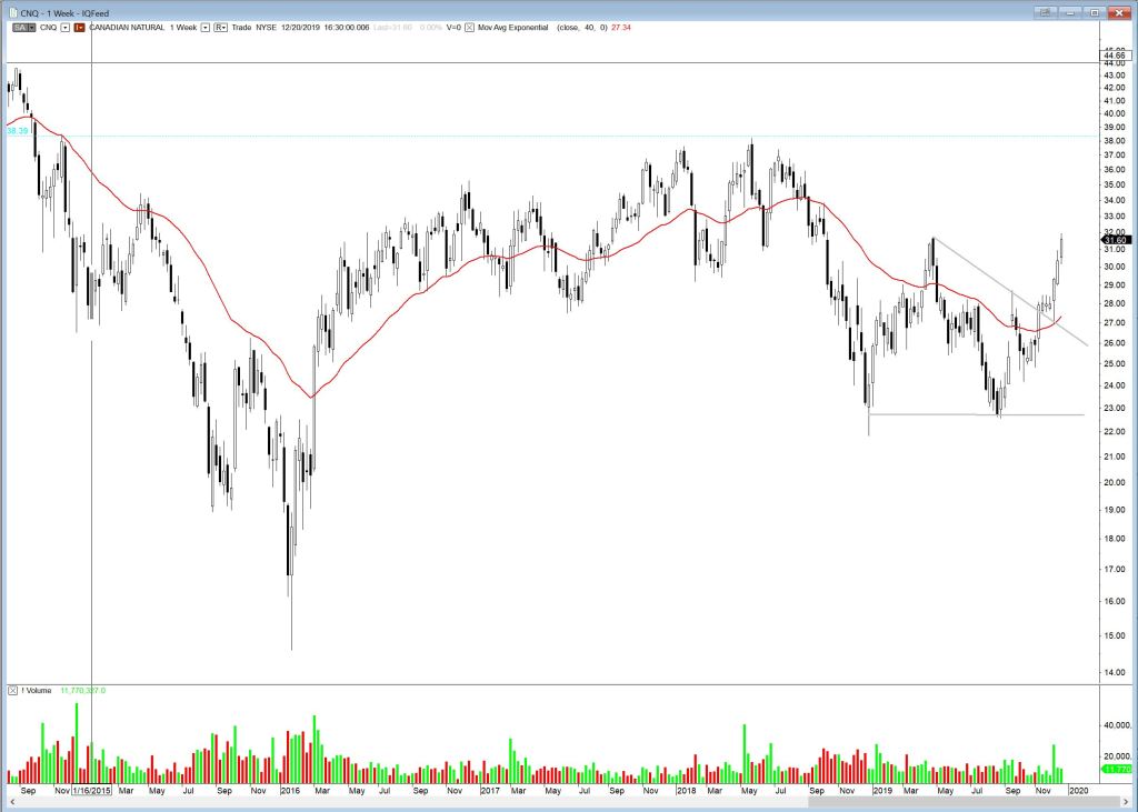 Just to prove that I’m not hallucinating regarding energy names, I’ll start with an energy company that has actually broken out and moved up. Canadian Natural Resources, CNQ. Price has broken out of a descending triangle and moved up strongly to test a local high.