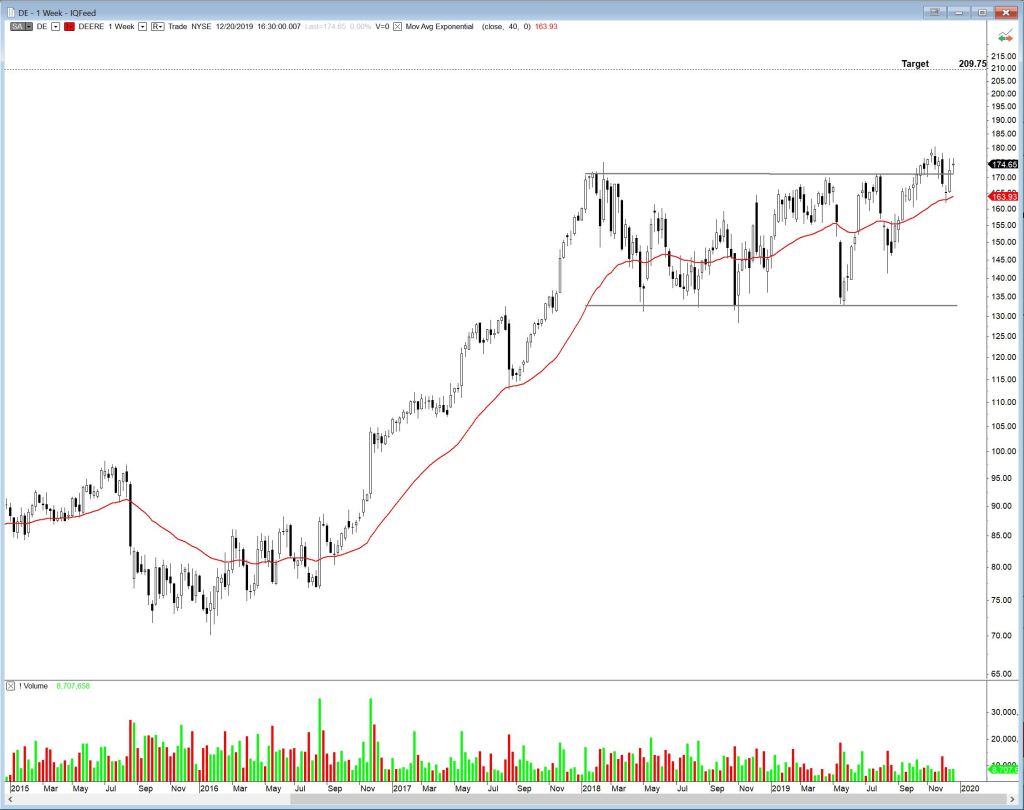 Deere, DE, has been in a rectangle trading range since early 2018. It broke out in October of this year, but stalled and retraced back inside the range to the 40 week EMA. It has broken out again, but needs to accelerate to clear congestion.