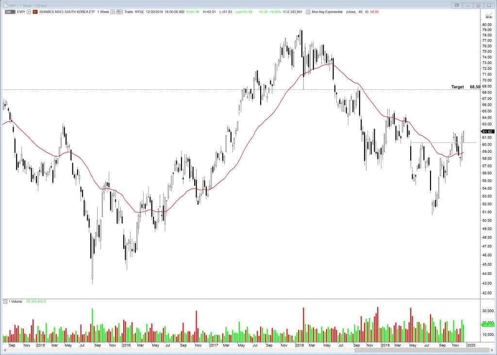 Internationally, FEZ, EEM, EFA, EWJ all continue their march upwards. As far as trades go, they are too extended in their current patterns to jump in now, but there are others. Emerging markets EWY and EWZ stand out for potential breakouts. MSCI South Korea ETF, EWY, has formed an inverted Head & Shoulders pattern (right shoulder is a bit messy, but I still like it), broken out above the 40 week EMA, retraced, then advanced strongly the last 2 weeks. Possible target is 68.50.