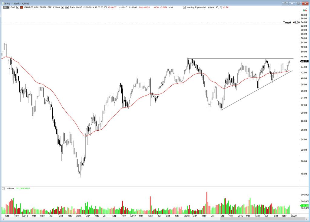 MSCI Brazil ETF, EWZ, is in a 22 month ascending triangle and is within testing distance of the upper boundary. One to watch. A breakout could advance to a possible target of 63.00.