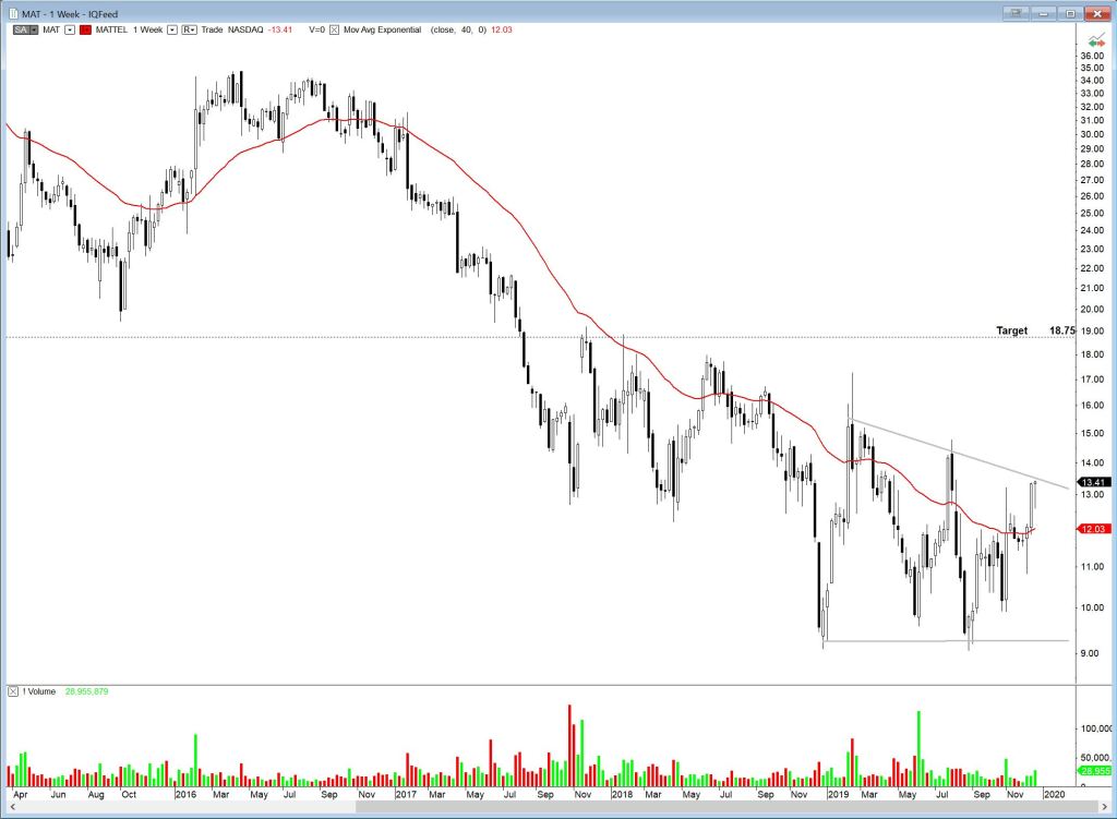 What’s Christmas without toys? Bah humbug, for sure. But no worries, here is a holiday season chart that could cheer you up. Mattel Toys, MAT, is challenging the upper boundary of a descending triangle. If it breaks out to the upside, target is 18.75.