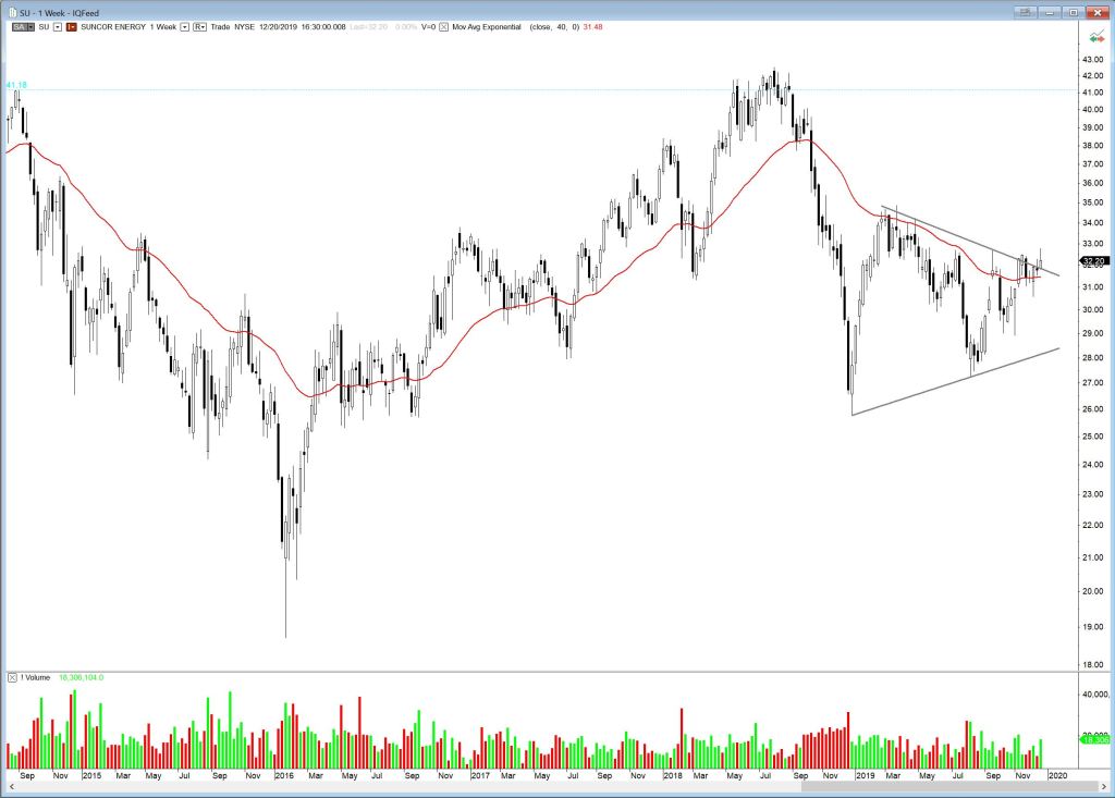 Suncor, SU, is testing the upper boundary of a symmetrical triangle. It’s a bit more subdued than CNQ, but a breakout could result in reasonable upside.