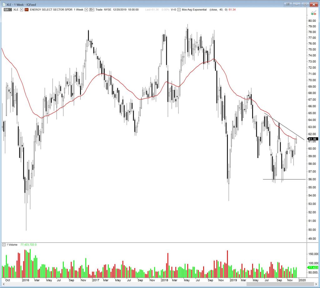 There is one overriding theme in the charts I looked at this weekend. Up. Note that SPY and QQQ have reached pattern targets (those have not been charted here, but I wanted to point that out), and may be due for consolidation or correction. Drilling down a little (forgive the pun) some energy names look interesting. Yes, I actually see some energy in energy names, believe it or don’t. Is it bottom fishing? Yup. I’ll also review a few international ETFs and a couple of currency futures.