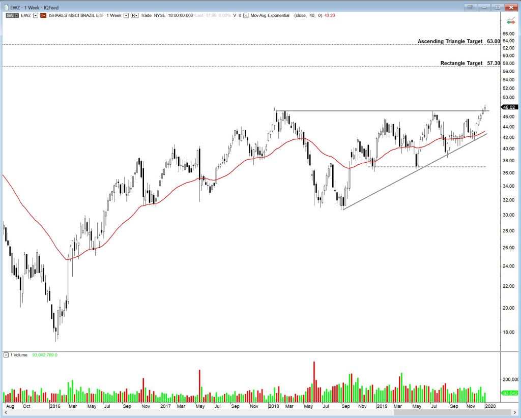 The Brazil ETF (EWZ) has broken out above the upper boundary of the pattern. The chart actually displays two possible patterns with different targets. There is an ascending triangle pattern with a possible target of 63, and a rectangle (indicated with dashed line) with a possible target of 57.30.