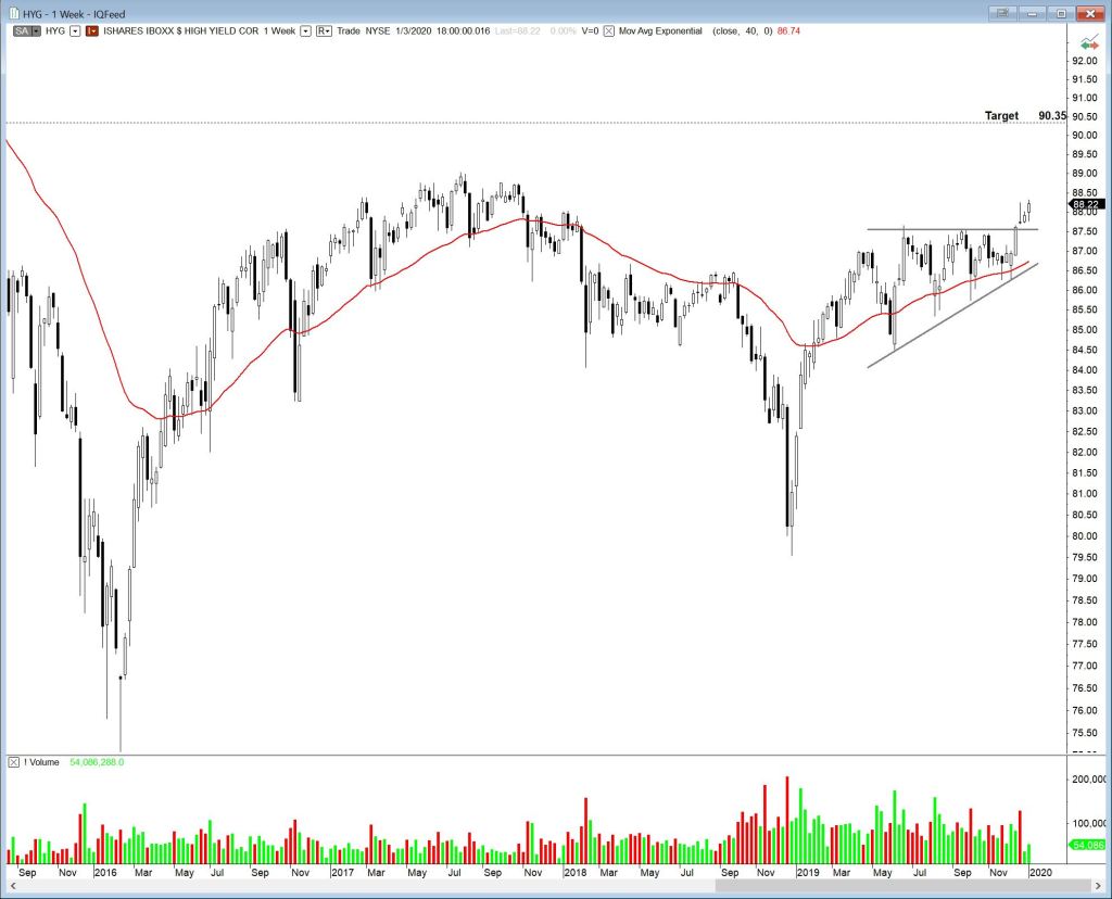 The High Yield Corporate Bond ETF (HYG), has broken out of an ascending triangle. Possible target is 90.35.