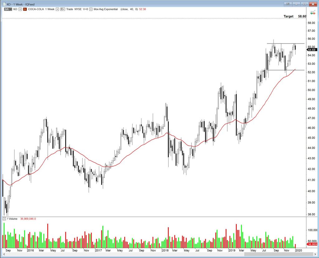 Coca-Cola (KO) is trading within a 5 month rectangle. A breakout could carry it to a possible target of 58.60. One thing to keep in mind – if there is a correction, we could see some rotation from growth to value.