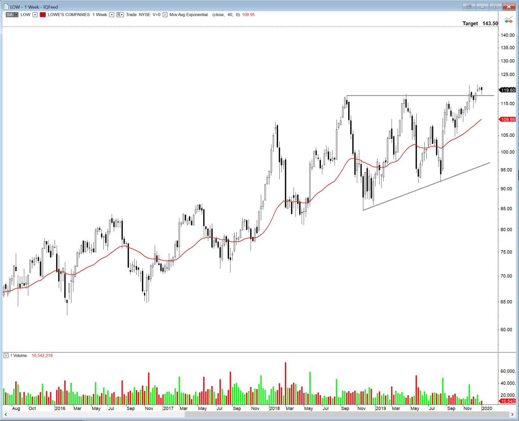 Finally, Lowe’s (LOW) has broken out from an ascending triangle and has been consolidating just above the upper boundary for three weeks. Possible target is 143.50.