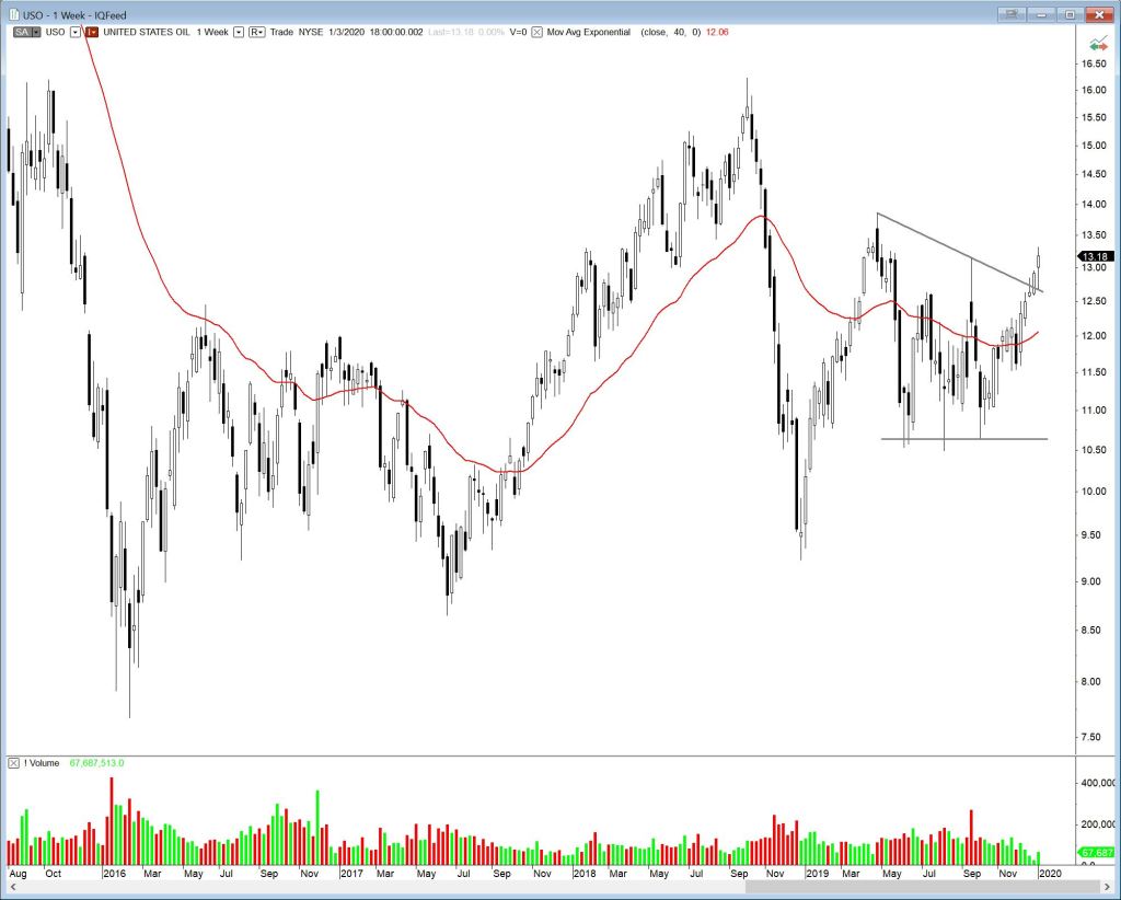 Energy, in a typical reaction, has been given a boost by the exuberant flinging of explosive devices in the Middle East. I’m of two minds regarding energy. One, short term, I think it has potential for upside under these conditions. Two, longer term, it is still saddled with the pessimistic sentiment regarding all fossil fuels. Having said that, it is breaking out, and this blog is about breakout ideas. So I present to you USO, the United States Oil ETF (UCO is similar).