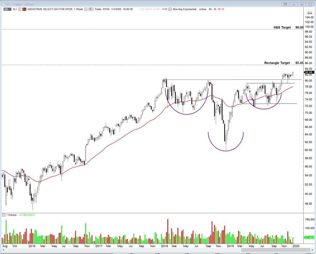 The Industrial ETF (XLI) is showing strength, especially when you consider the ETF’s reaction to geopolitical news on Friday. It was up strongly on Thursday with the rest of the market, and on Friday at the open fell with the rest of the market. But at that point XLI diverted from the market path, and ended with a significant up day. The week also ended up.