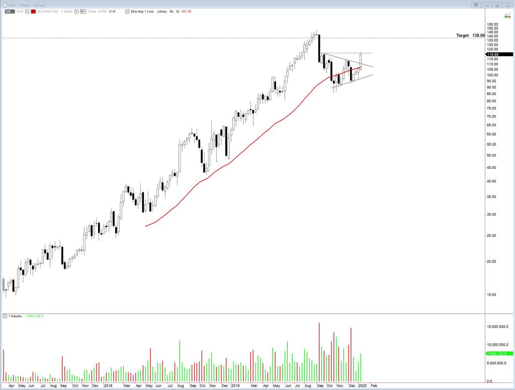 Alteryx (AYX) had a strong week, blasting through 40 week EMA and the upper boundary of a symmetrical triangle. It tested resistance formed by the base of the triangle. Possible target, if it can overcome this minor resistance, is 138.00.