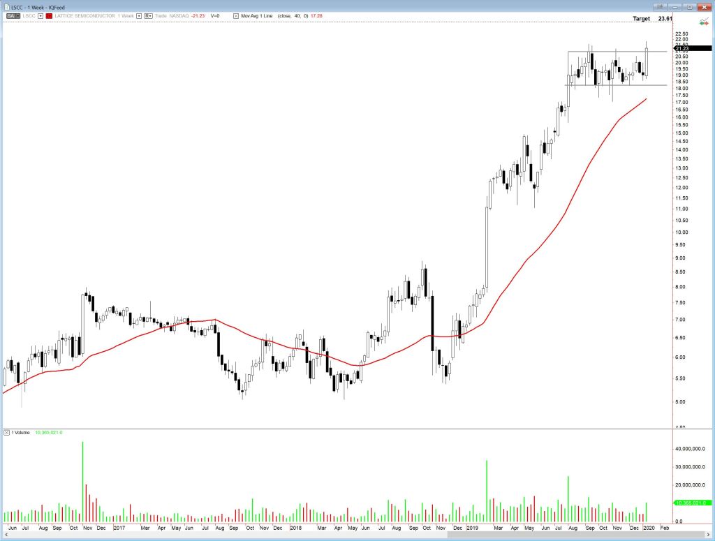 Lattice Semiconductor (LSCC) has formed a 5 month rectangle and made a strong attempt at a breakout last week. I still consider it to be in “Watchlist” mode, and would like to see another daily close above the rectangle upper boundary. Possible target is 23.60.