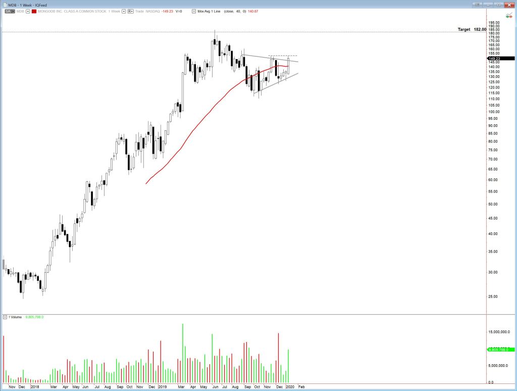 MongoDB (MDB) has formed a symmetrical triangle and moved strongly last week, breaking the 40 week EMA and testing the upper triangle boundary. Note that this could also be classified as an inverted Head & Shoulders (if you extent the upper boundary to the left), but I prefer H&S patterns with near-horizontal necklines, so I call this a symmetrical triangle. MDB pierced the upper boundary of the triangle and tested minor resistance from November before pulling back slightly. Possible target is 182.00.