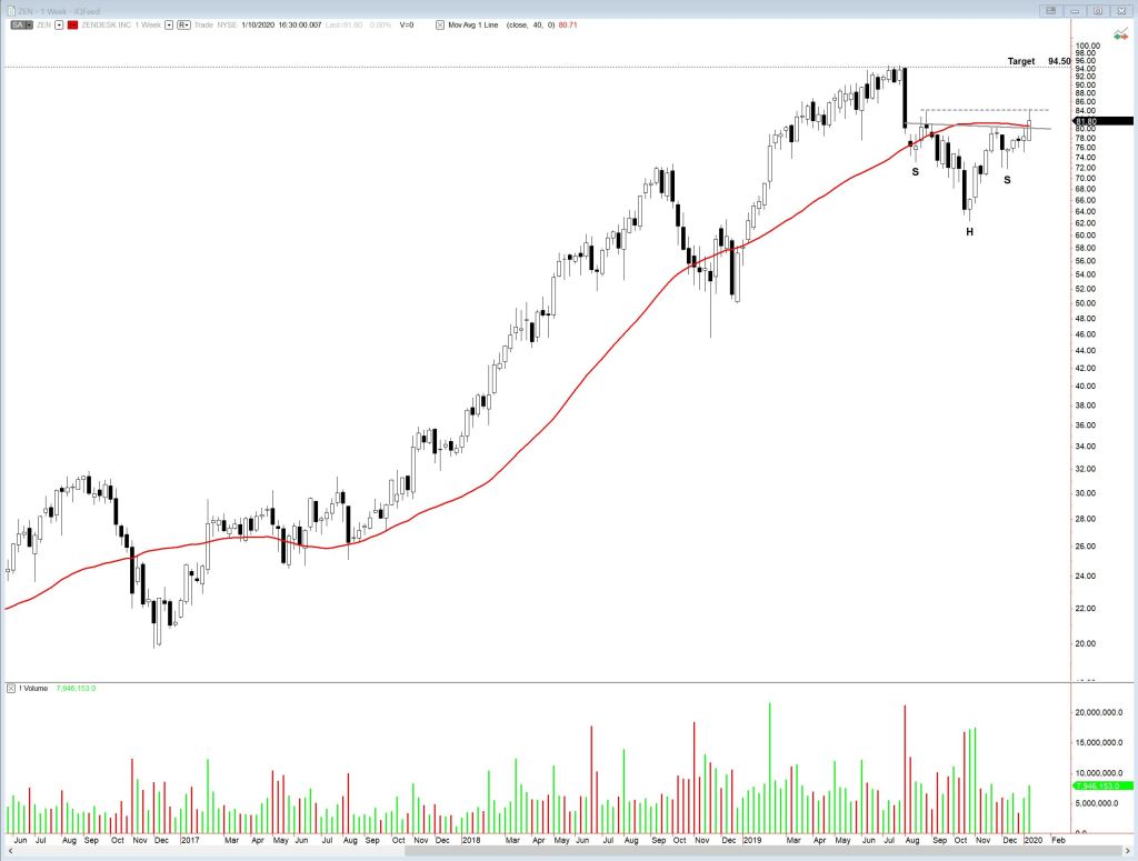Zendesk (ZEN) has formed an inverted Head & Shoulders. The neckline and the 40 week EMA, which are similar, were broken last week. Price closed above the neckline, testing the recent high from the last week of August before pulling back slightly. Possible target is 94.50.