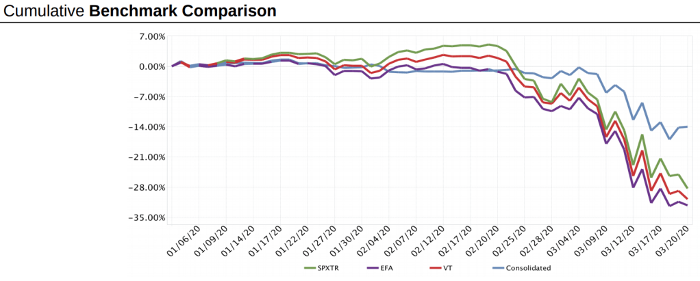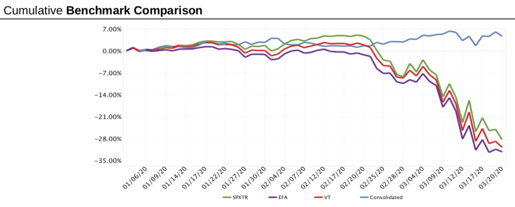 Let’s start with the good news, two of the long term retirement accounts. As of March 20, they are up 4.7% for the year. These accounts illustrate strong discipline and good outcomes. The chart below compares the cumulative accounts to the SPXTR (S&P Total Return, EFA (MSCI EAFE ETF) and VT (Vanguard Total World Index).