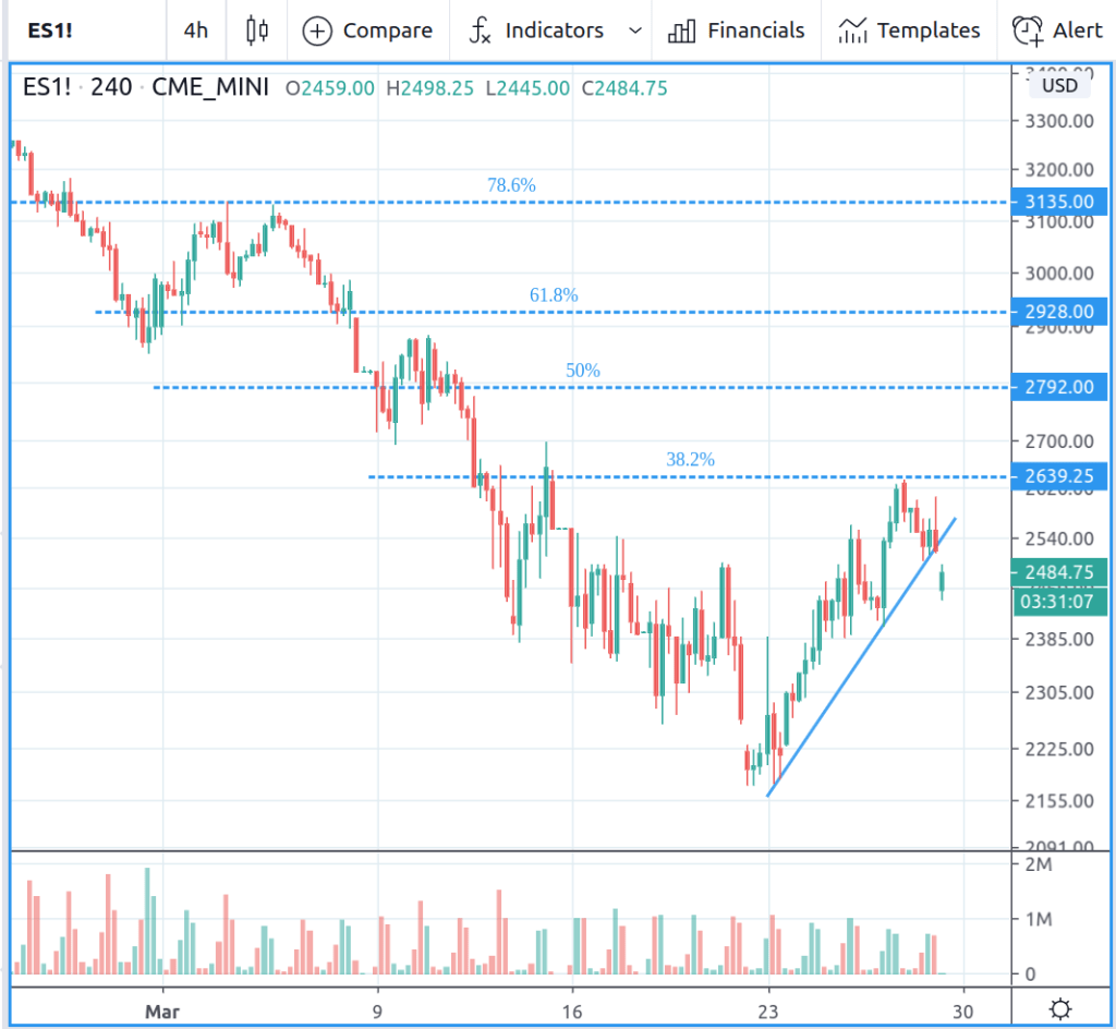 So just how is the market doing now? Here’s a 240 minute chart of the ES futures on Sunday evening March 29. Last week, the ES found a bottom at 2174 and bounced sharply up most of the week, closing at 2524. It retraced to the 38.2% Fibonacci line before falling back. Not a bad week. A fairly typical bear market rally. Time will tell if it retests the bottom now, or if it makes an attempt to reclaim 2800, which is near the 50% retracement. It gapped down at the open this evening, but it is making an attempt at recovering.