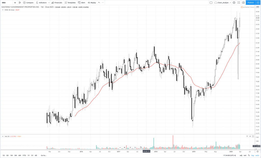 Easterly Government Properties Inc, DEA, has fluctuated with the market but has bounced back to all-time highs. The company is a REIT that leases properties to the US government.