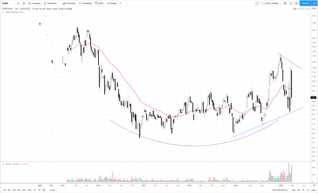 Euronav, EURN, engages in the transportation and storage of crude oil. Given that I haven’t bought a tank of gas in four weeks, I would suggest their storage business might be getting busy. The Saudis and Russians may kiss, make up and cut production, but they can’t make self-isolating soccer moms buy gasoline. EURN has formed a nice bottoming pattern and a series of higher lows, and is currently in a symmetrical triangle.
