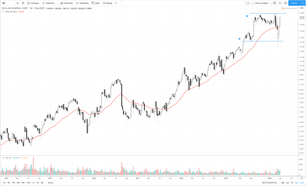 Let’s finish off with Dollar General, DG, good ol’ Consumer Staples, consolidating in a 9 month rectangle.