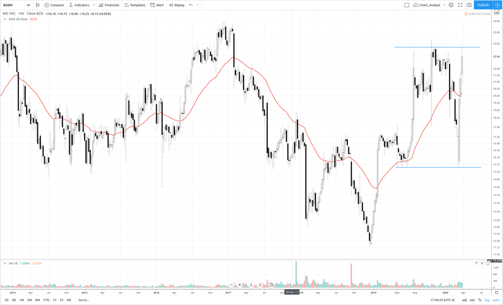 Moving away from REITs and on to Financial Services, NIC Inc, EGOV, combines technology and financial services to provide digital solutions and secure payment processing to governments.